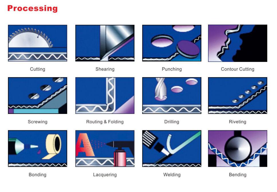 When aluminium-plastic panel is under edge fold construction, it shall be grooving at edge fold section and it may open V-groove and U-groove, etc. according to edge fold requirement, several typical grooving ways see figure C.l. It shall make use of Special grooving machinery for aluminium-plastic panel to ensure grooving depth is not damage the opposite aluminium material and it shall be left with 0.3 mm thick plastic layer. It may adopt reinforcing measures as bordered rib, etc. as it is required at grooving section. Unit is mm 4) Lacquer Cleaning Information: