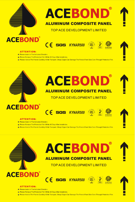 The film protects the paint finish during fabrication and installation. It should, however, be removed as soon as possible after installation of the panel on site, especially in the case of panels exposed to sunlight and weather. The protective film should only remain temporarily on the panels. Arrows are printed on the film to indicate the direction of coil-coating (important for metallic finishes). Opaque film 80 μ thick with ultraviolet barrier is used on PVDF.