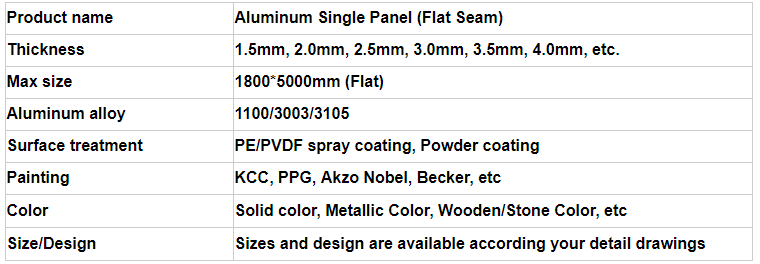 Aluminum solid panel is made from high grade of aluminum metal alloy to make flat, angled, curved, round and various other complex shapes. Its regular thickness are 2.0mm, 2.5mm, 3.0mm, and 4.0mm. model 3003 and phase H24 or high class aluminum , the custom max dimension is 1220x2440 (mm). It is composed of plate, reinforcement bars and corner racks. The corner racks can be shaped from plate or punched or riveted at the edge. The reinforcement bars are soldered on back of plate to reinforce intensity and hardness of whole pane, this structure gives the panel better flatness and shock resistance as well as the long lifetime. If you want it to be sound and thermal isolation, we can add sound and thermal isolating material inside the panel.